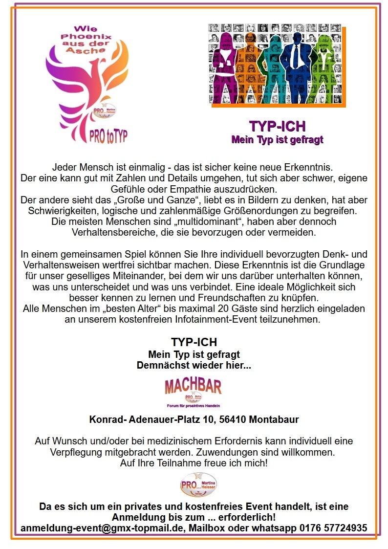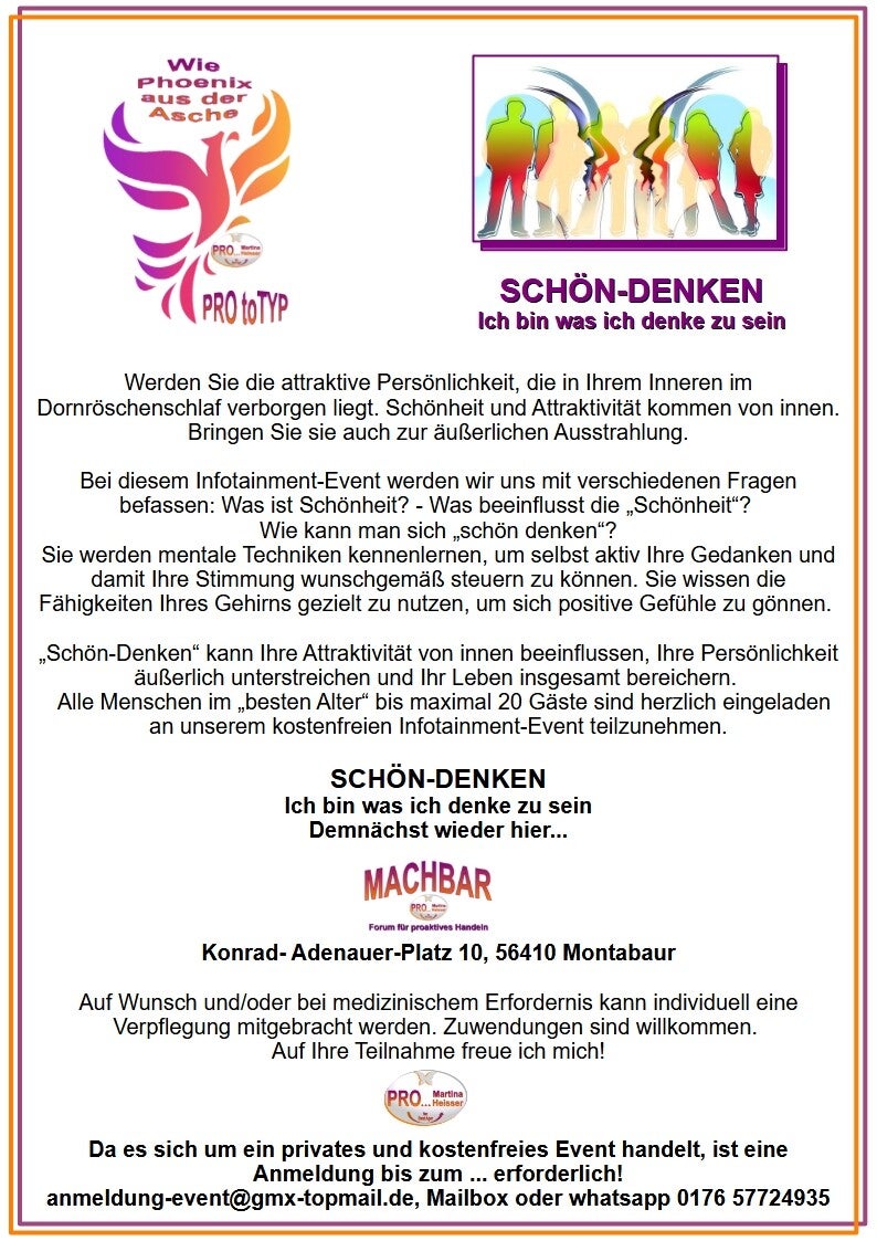 Bei unserem Infotainment-Event werden Sie mentale Techniken kennenlernen, um selbst aktiv Ihre Gedanken und damit Ihre Stimmung wunschgemäß beeinflussen zu können.